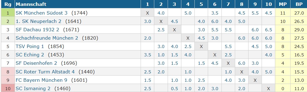 Gegen den mit einem Großmeister an Brett 1 stärker besetzten Gegner gab es am Ende eine verdiente Niederlage. Nachdem Michael Boger an Brett 1 nach knapp 1 Stunde gegen GM Bryan Smith sich geschlagen geben musste, entwickelte sich ein spannender Spielverlauf. Erik Schaffer und Simon Wang mit Remis, sowie Hannes Candussio mit einem Sieg brachten uns wieder heran. Hermann Borchert remisierte, so hatte Stefan Pachmayr in einer unklaren Zeitnotstellung den Mannschaftssieg auf der Pfanne, konnte aber seinen Angriff leider nicht durchbringen und verlor. So konnte Daniel Kossa auch nichts mehr ausrichten und remisierte seine total ausgeglichene Stellung. Die Mannschaft hat sich aber gegen die durchweg DWZ-stärkeren Gegner gut geschlagen! Die Chancen auf den Aufstieg sind nach dieser Niederlage gesunken. Aber: Unter den Top 10 – Spielern der B1-Klasse sind 3 Dachauer!